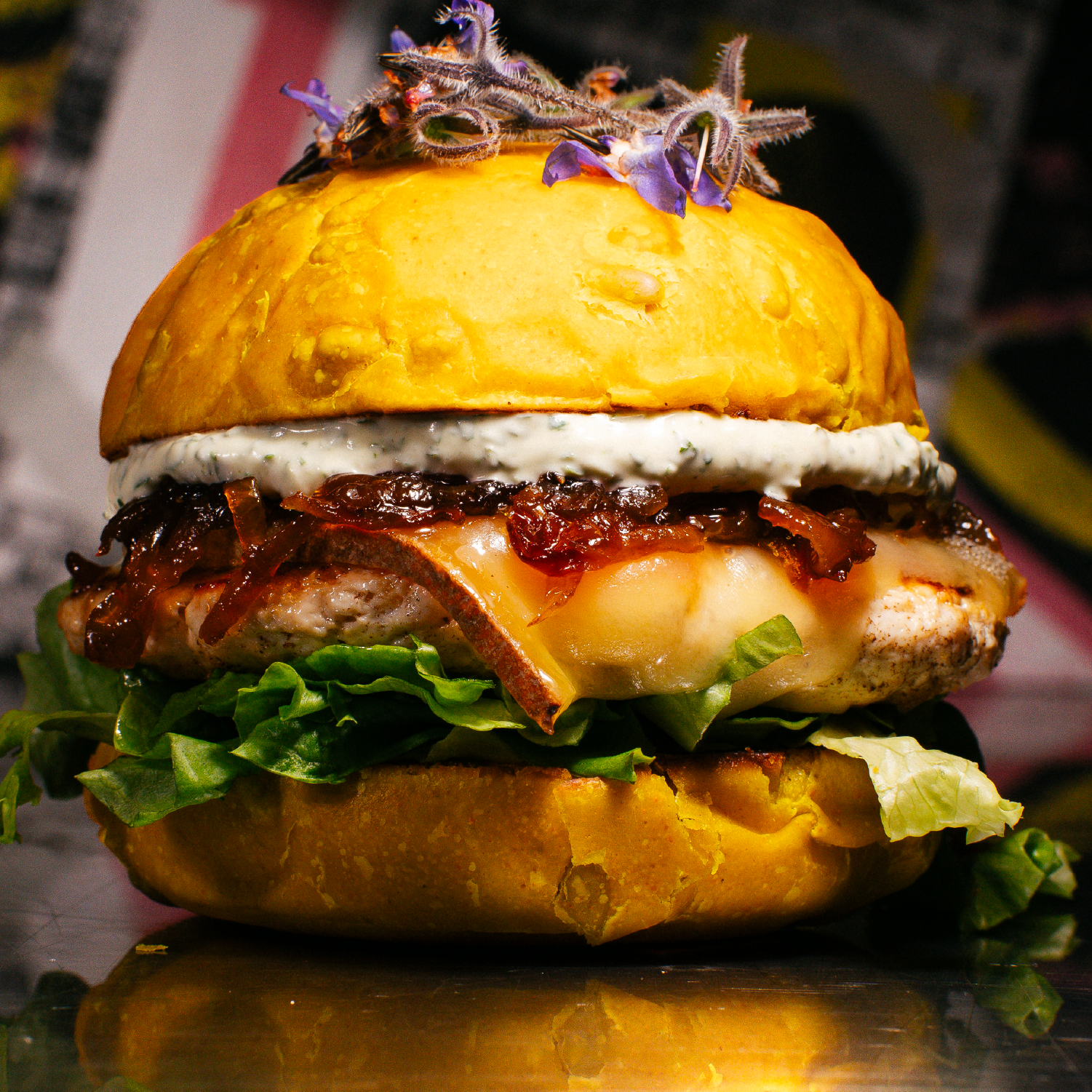 BUN TOURNESOL (LE PAIN & LE VIN) / STEAK DE POULET (DE L’ISÈRE) MARINÉ À LA BIÈRE ARCKA (BRASSERIE ARCKA) / MONTGRANIER (ENTREMONT-LE-VIEUX EN CHARTREUSE) / CONFIT D’OIGNONS AU MIEL DE BELLEDONNE / SAUCE YAOURT AUX HERBES (LA LAITERIE GRENOBLOISE) / FLEURS DE BOURRACHE (FERME URBAINE MILLEPOUSSES)