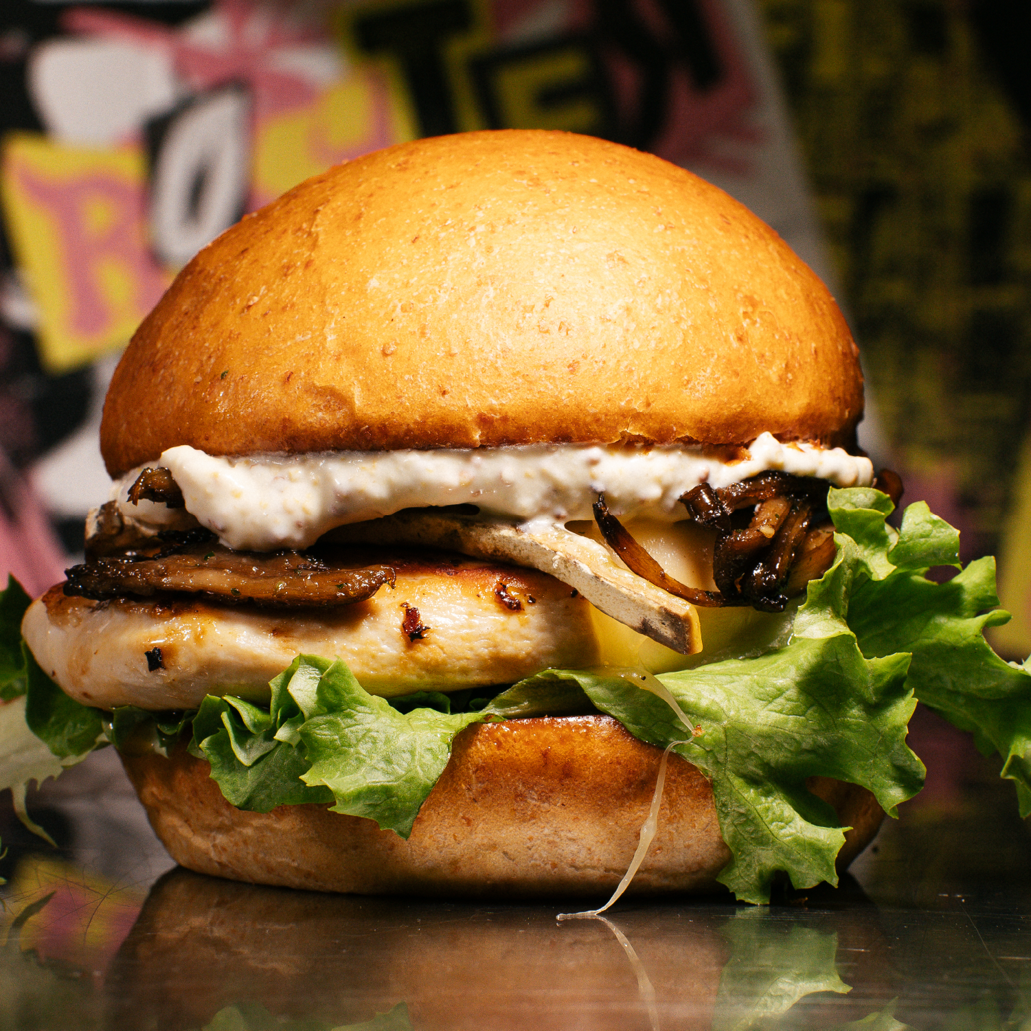 BUN À LA FARINE DE MEULE (LES PETITS BUNNIES) FILET DE POULET (DE L’AIN) / TOME DES BAUGES FERMIÈRE (FERME DE LA MARMOTTE EN BAUGES) BATAVIA (FERME AGRO ÉCOLOGIQUE DU MARAIS) PLEUROTES POÊLÉES (CHAMPII) / CRÈME DE MOUTARDE À L’ANCIENNE (MILLEFAUT & BADIN)